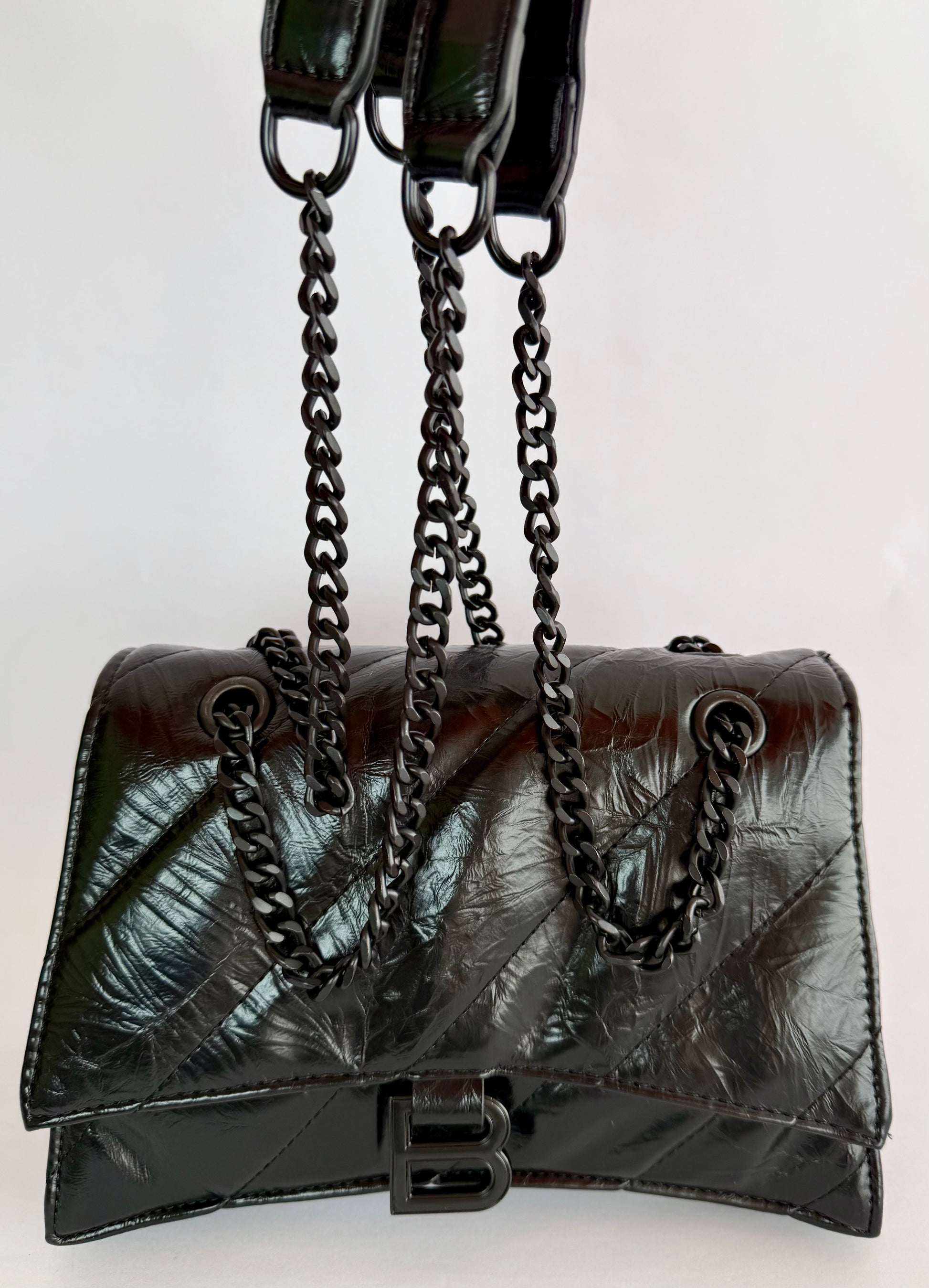 Bolso Balen.ciaga Crush está confeccionado en cuero sintético, esta referencia combina lujo y comodidad, es versátil y funcional, cuenta con 3 servicios, uno de ellos tiene cremallera garantizando seguridad, sus herrajes son de color negro, la cadena removible permite llevarlo cruzado o de hombro, tiene unas medidas de 24 cm de ancho, 16 cm de alto y 10 cm de profundidad, es el accesorio perfecto para quienes buscan estilo y practicidad, llego en color negro.