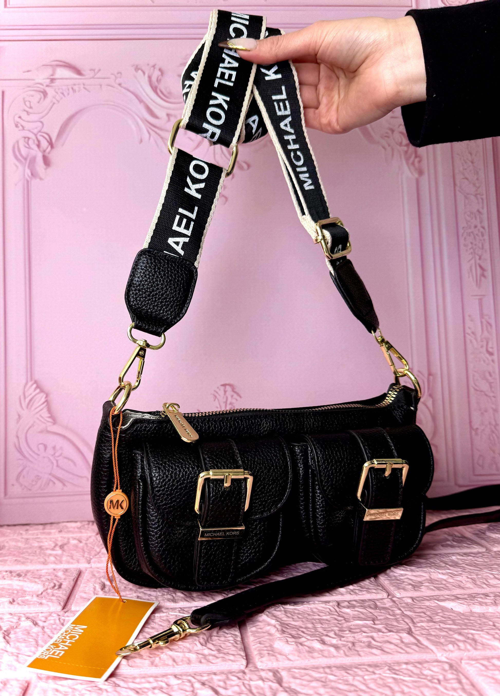 Bolso Michael Kors elaborado en cuero sintético, con una forma poco convencional, pero super top tiene el clásico monograma “MK” en la base. Tiene dos bolsillos frontales con solapa y hebillas doradas decorativas, además de detalles metálicos dorados en la cremallera tiene dos correas, una en cuerina y otra en tela para que lo combines de la mejor manera de acuerdo al outfit y ocasión, viene contramarcado, es replica top quality.