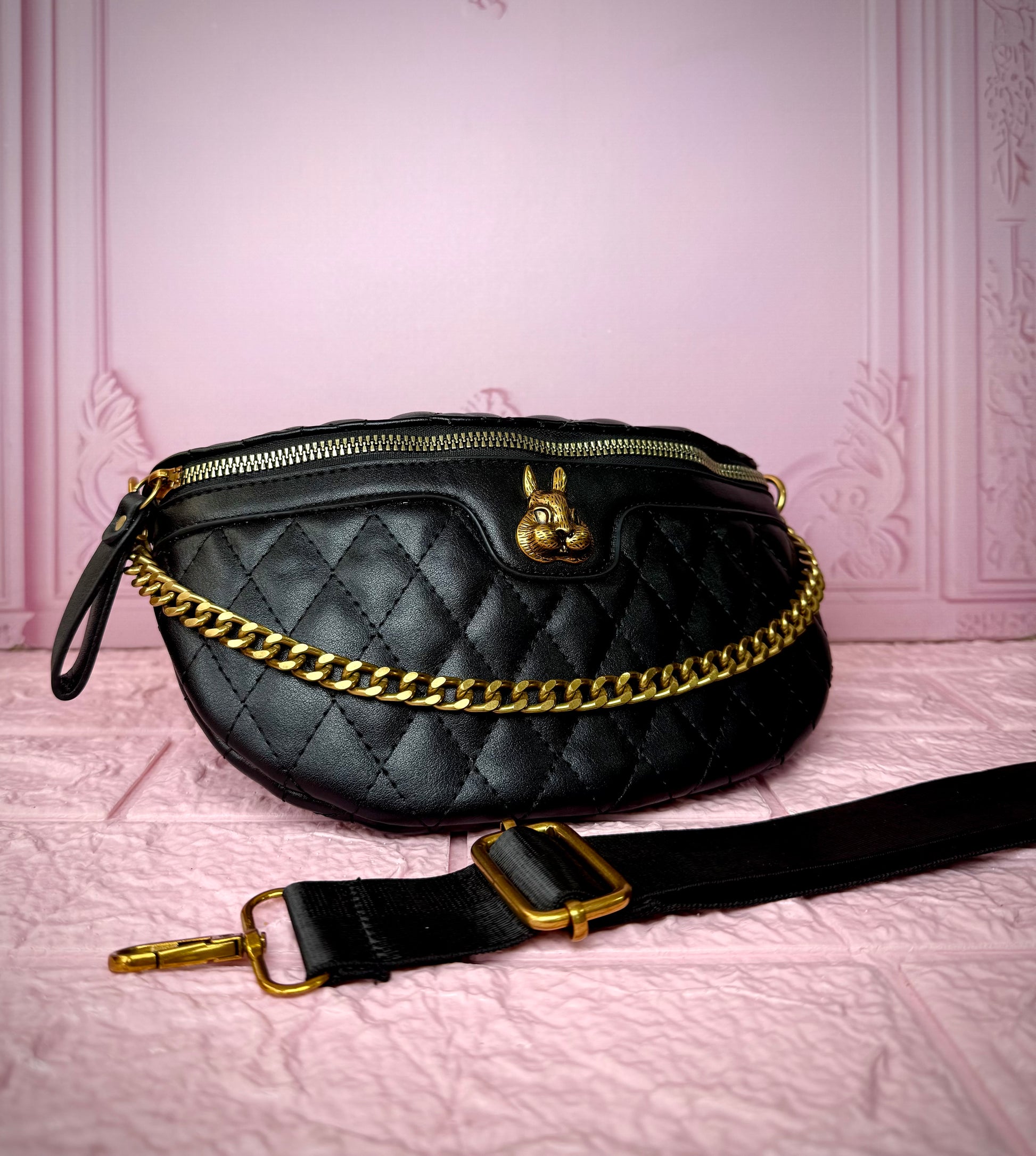 Bolso tipo riñonera elaborada en cuero sintético con diseño capitoneado en rombos, cuenta con una cremallera dorada y una cadena que le da un toque de lujo, tiene un accesorio en forma de conejo en la parte frontal, en su parte interna tiene otro bolsillo garantizando mayor espacio y seguridad, trae una reata de tela para llevarla cruzada en la cintura, sus medidas son 24 cm de ancho, 16 cm de largo y 8 cm de profundidad.